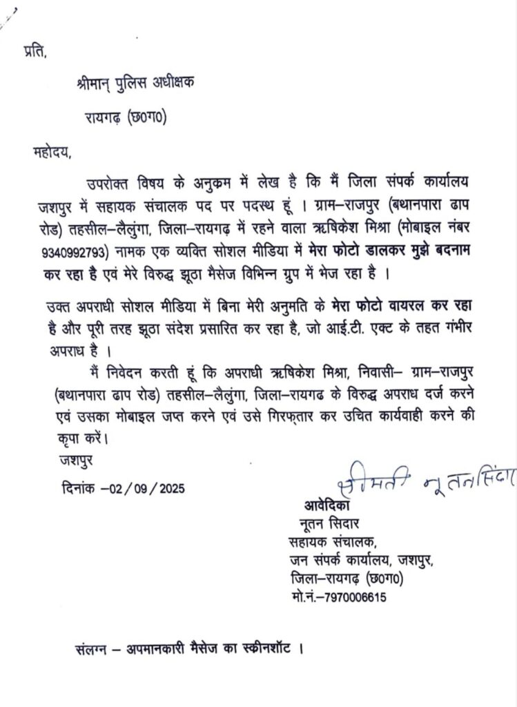 नूतन सिदार ने पुलिस अधीक्षक रायगढ़ को दिए आवेदन में आरोप लगाया है कि ऋषिकेश मिश्र उनकी तस्वीर और संदेश सोशल मीडिया पर वायरल कर बदनाम कर रहे हैं। इसके आधार पर उन्होंने आईटी एक्ट के तहत कार्रवाई की मांग की है।